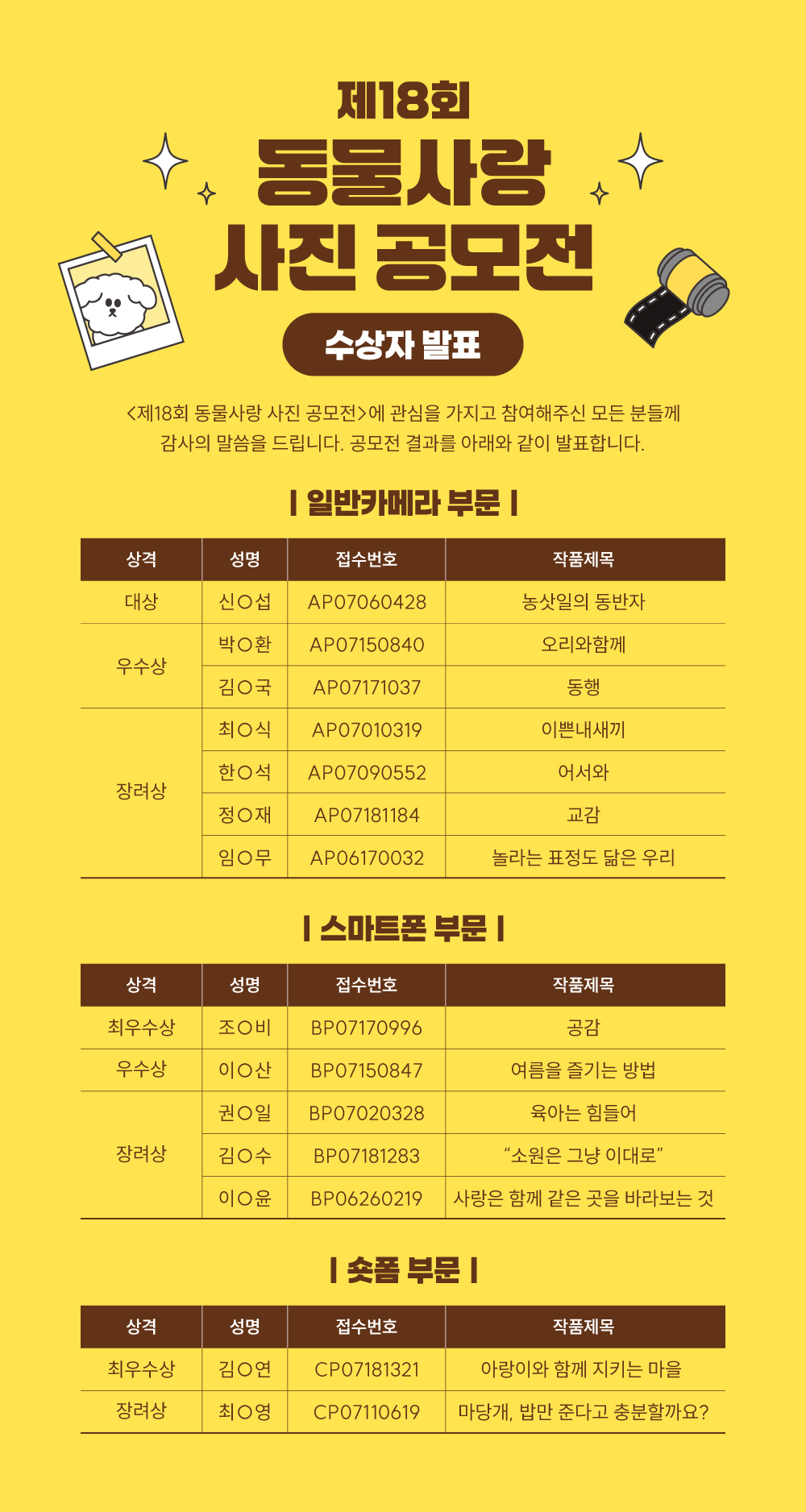 다시 한 번 제18회 동물사랑 사진 공모전에 보내주신 많은 관심과 성원에 감사의 말씀을 전합니다.